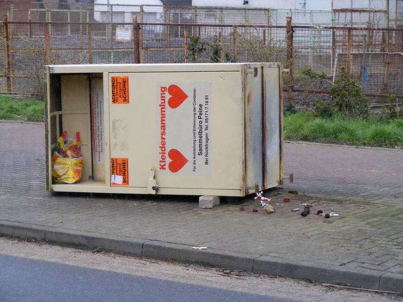 Aber ein RIESEN KRACH ertönt, als er plötzlich und unerwartet aus Versehen und ohne Absicht zufällig durch einen leichten Schubs mit der Außenkante seiner Schuhsohle gegen eine Altkleider-Tonne tritt und diese polternd umfällt... |